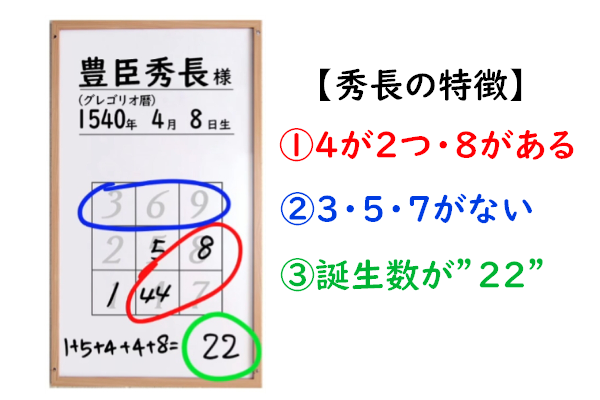 秀長も、誕生日の数字1・5・4・4・8を決められた場所に書き入れます。”0”は必要なく、場所もありません。