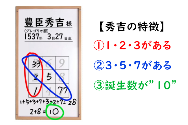 1・5・3・7…と、順番にすべて書き込むと、秀吉の大きな特徴は、