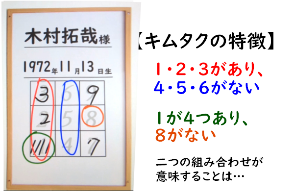 俳優の木村拓哉さんを、ピタゴラスのチャートで診断してみました。数字の並べ方3×3のマス目に、1から9までの数字のポジションが決められているので…